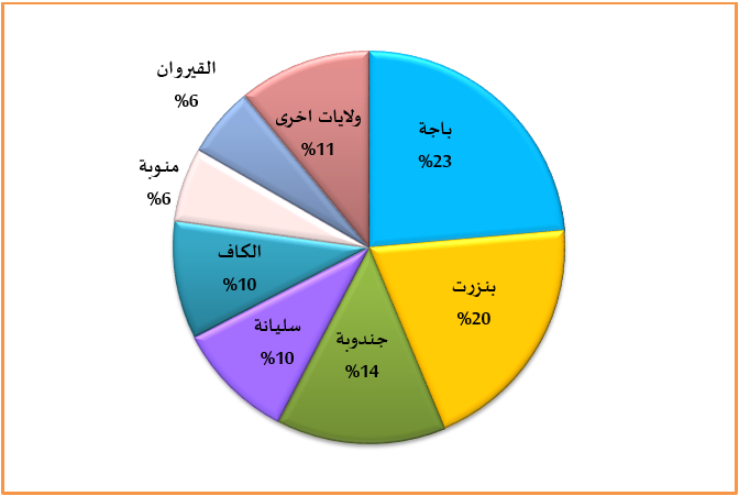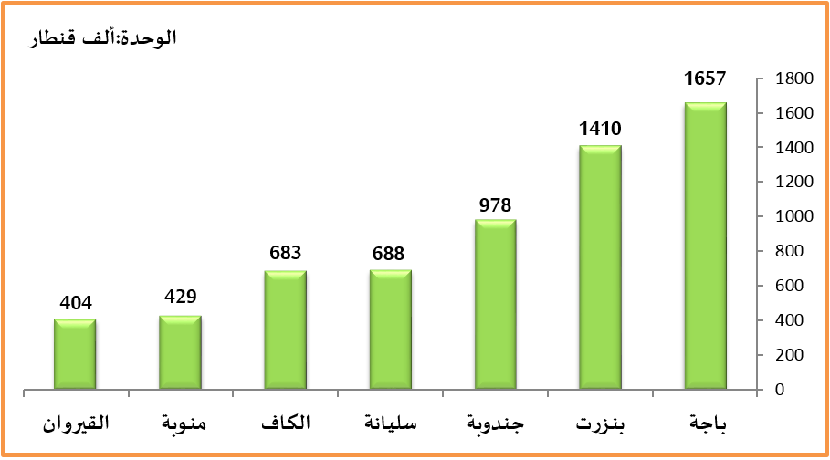 وتحتل ولاية باجة المرتبة الأولى حيث تمّ تجميع ما يقدّر بــ 1,6 مليون قنطارا أي بنسبة 24 %، تليها ولاية بنزرت بحوالي 1,4 مليون قنطار بنسبة 20 % فولاية جندوبة بنسبة 14 % تقريبا وولاية سليانة بـحوالي 10% علما أنّ ولايات الكاف والقيروان ومنوبة وزغوان تحصلت على نسب متفاوتة لتبلغ معا 26 % تقريبا فيما تحصلت بقية الولايات على 6 %.