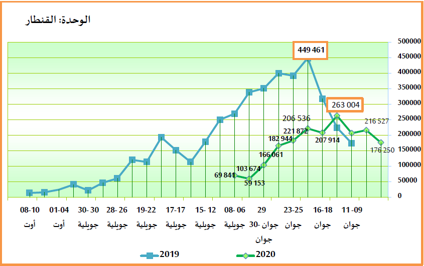 وقد بلغ النسق اليومي ذروته يومي 16 و 18 جوان مسجلا 004 263 قنطار مقابل 461 449 قنطار في يومي 19 و 22 جوان .